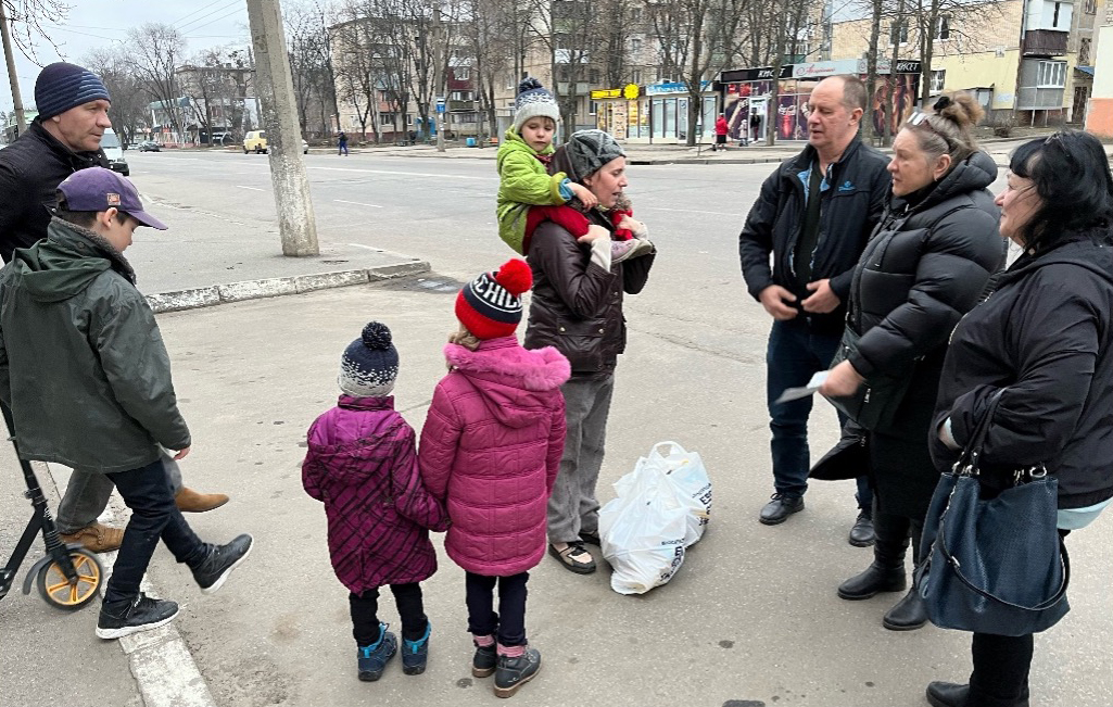 Vadim, Ebenezer-Teamleiter in der Ukraine (rechts mit schwarzer Jacke) und Yanya (rechts, mit Zettel in der Hand) besuchen jüdische Familien in der Ost-Ukraine, im gefährlichen Kriegsgebiet. Sie bringen Plastiktüten mit Lebensmitteln und informieren über die Möglichkeit der Aliyah mit Hilfe von Ebenezer.